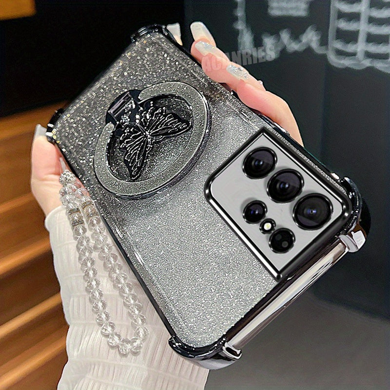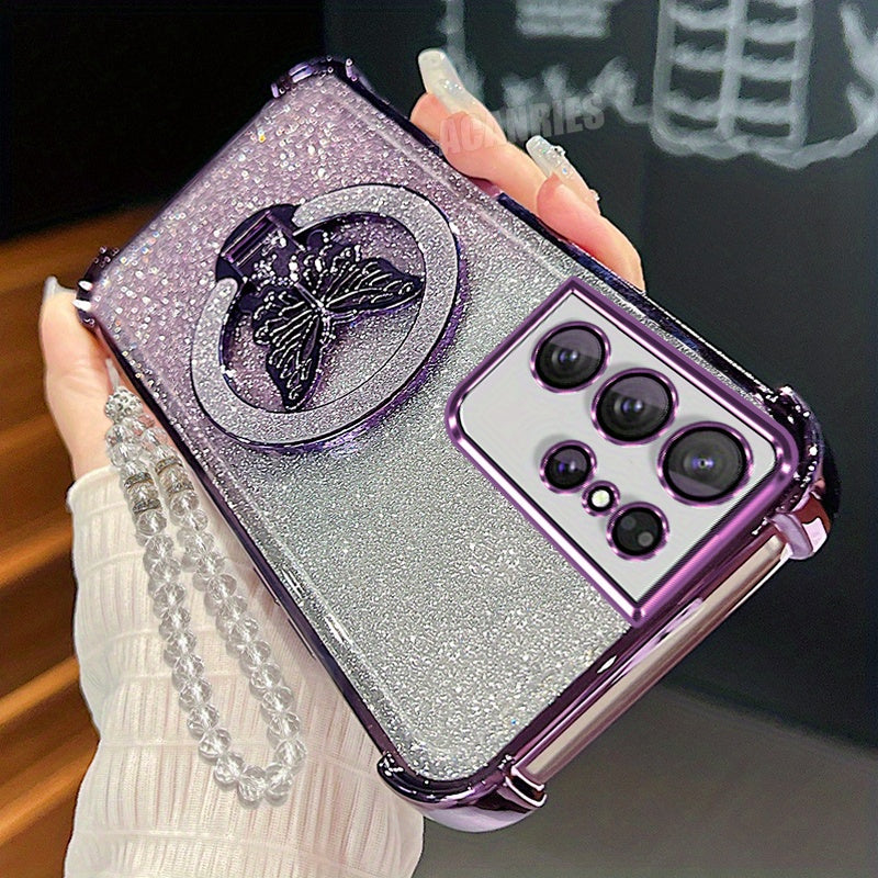 Brățară transparentă cu lanț și suport pentru fluture, proiectată pentru for samsung for galaxy S21 Ultra 5G, cu efect de gradient și sclipici pentru protecție antișoc și un spate moale